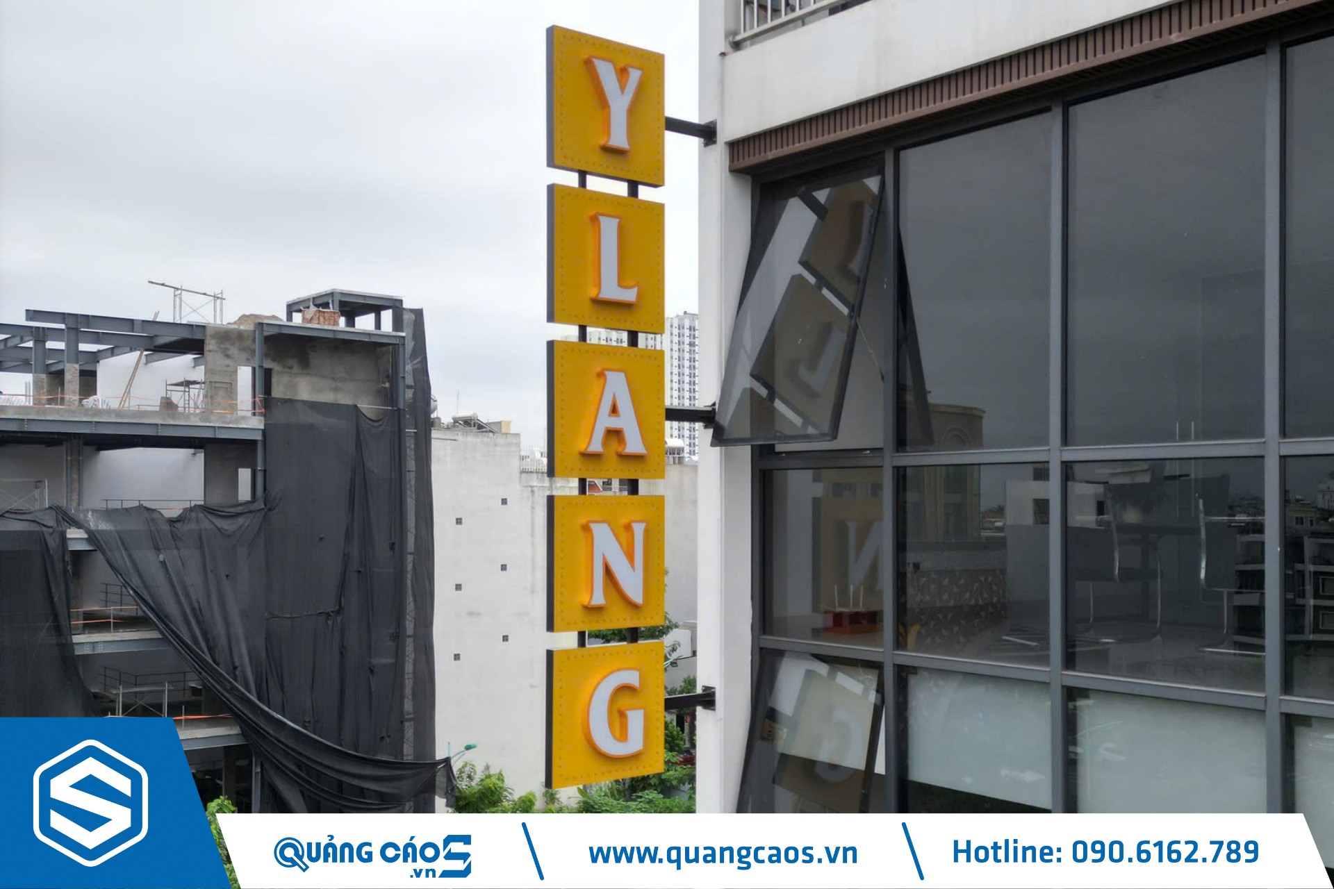 - Biển Vẫy Dọc (Blade Sign): Biển vẫy có hình chữ nhật đứng, hiển thị từng chữ cái Y-L-A-N-G trên các ô vuông nền vàng.